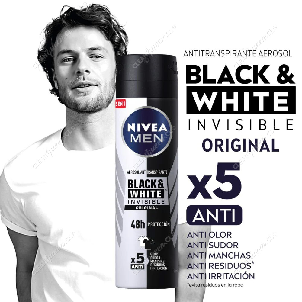 El antitranspirante NIVEA MEN Invisible Black & White te brinda 48 hs de protección antitranspirante sin dejar manchas blancas en tu ropa negra y reduciendo las manchas amarillas en tu ropa blanca. De esta manera el negro queda negro y, por primera vez, el blanco queda blanco por más tiempo.