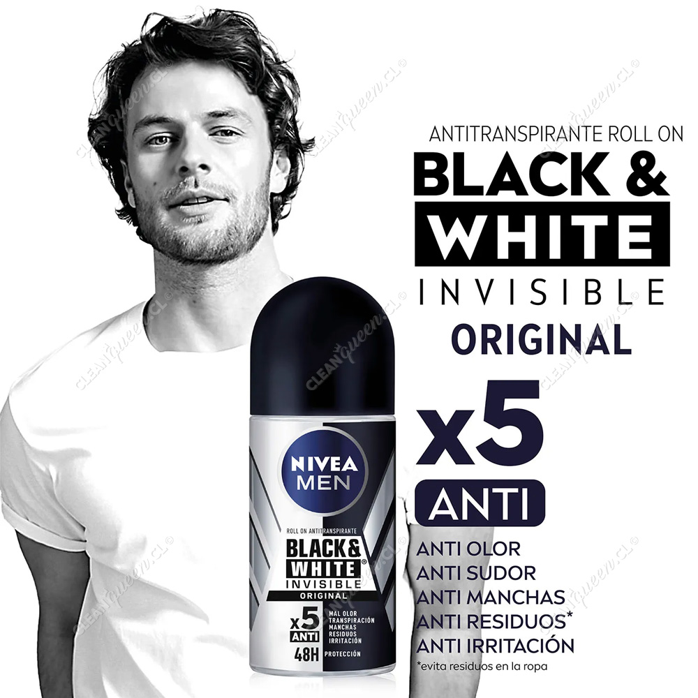 NIVEA MEN Invisble for Black&White: El nuevo antitranspirante desarrollado con expertos textiles te ofrece una proteccion antitranspirante sin riesgo de dejar manchas blancas en ropa negra, y reduce la formación de manchas amarillas en ropa blanca. Su fórmula única te protege por 48 hrs, y ayuda a mantener el color original en tu ropa.