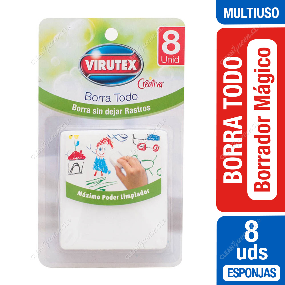 Borrador Mágico Virutex es una esponja que borra todo hecha en base a melamina, remueve incluso las manchas más difíciles. No requiere detergentes. Limpia manchas en paredes, electrodomésticos, línea blanca, mesas con melamina, bañeras. etc. Remueve suciedad y rayas de colores de las paredes. Ideal para quitar suciedad de superficies duras.