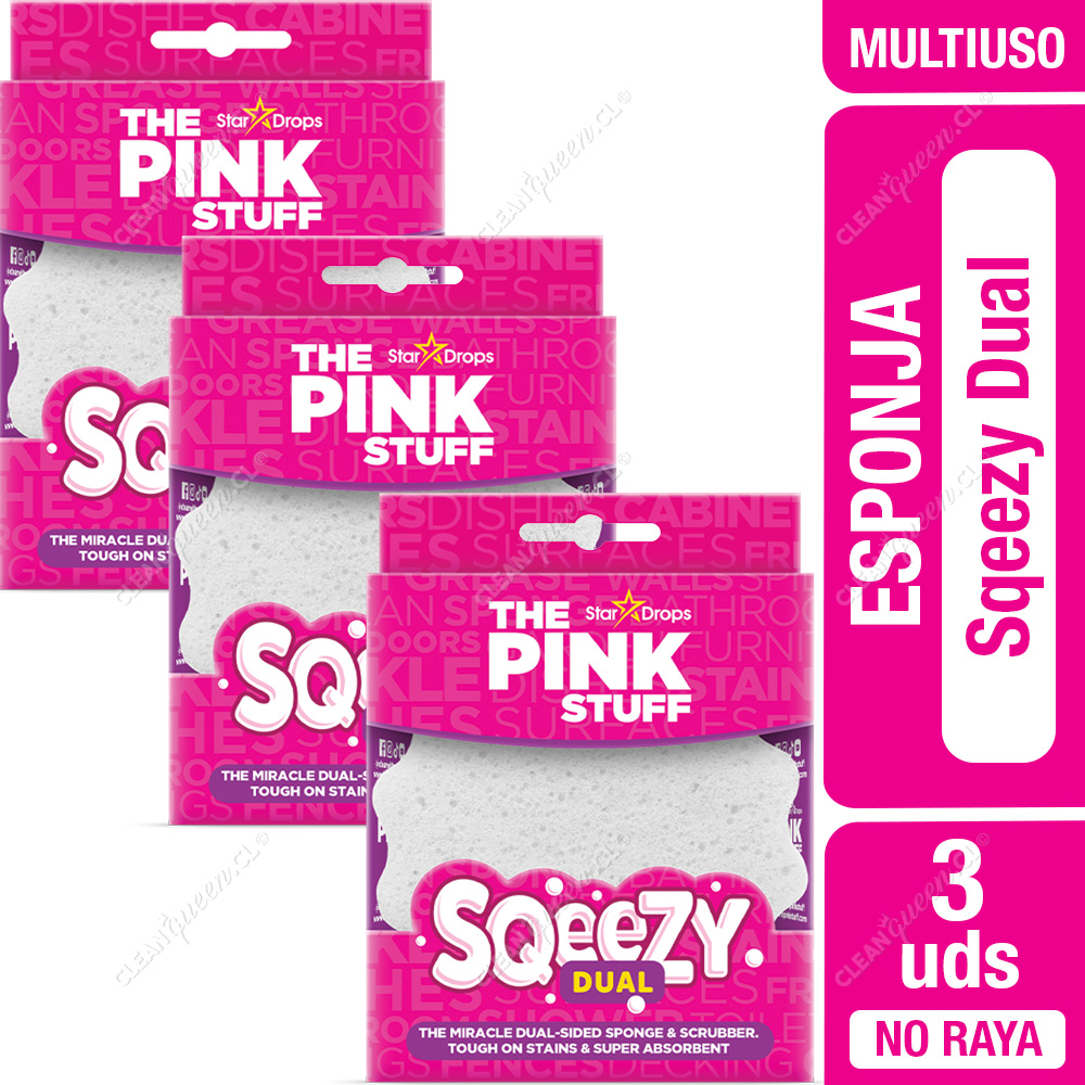 La Esponja Dual Sqeezy de doble cara The Pink Stuff es ideal para usar en múltiples superficies del hogar, la cocina, el baño e incluso en exteriores. Por un lado es una esponja suave y por el otro es igual a la Sqeezy original.