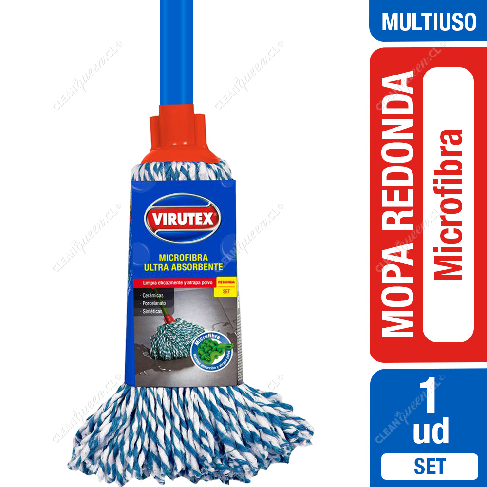 Set Mopa Redonda Microfibra atrapa las partículas de polvo y el líquido en una sola pasada. Su uso en seco permite atrapar la suciedad por estática, evitando que el polvo se levante, disperse o arrastre. No retiene malos olores. Es más resistente y durable que el algodón. Resiste altas temperaturas y lavados frecuentes.