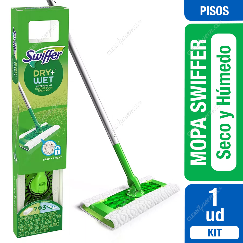 El Kit Mopa Swiffer incluye 1 mopa Swiffer, 7 paños secos de alta resistencia y 3 paños húmedos.