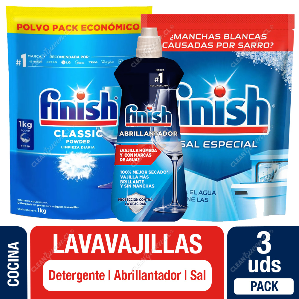 Pack Lavavajilla Finish: Sal 1 Kg, Abrillantador 400 ml y Detergente Polvo Repuesto 1 Kg