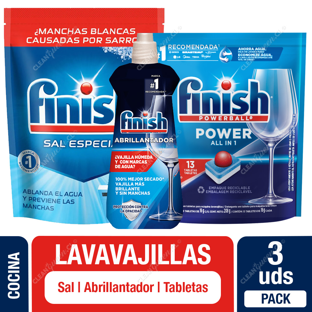 Pack Lavavajilla Finish: Sal 1 Kg, Abrillantador 400 ml y Detergente Tabletas 13 un